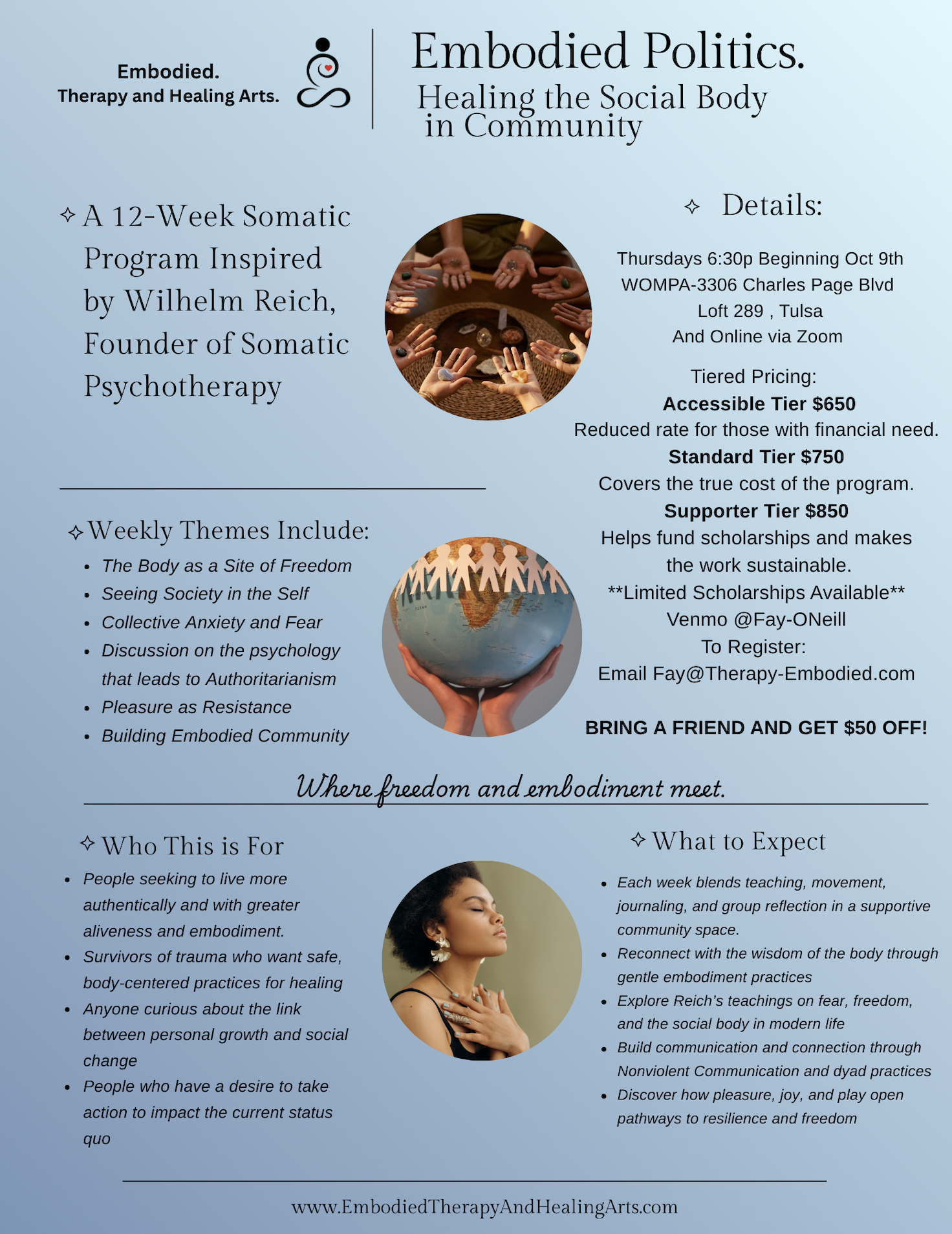 This 12-week program explores the powerful connection between authoritarian politics and the body. Together we’ll examine how oppression imprints itself in the nervous system, how collective anxiety fuels authoritarian movements, and how reclaiming joy, pleasure, and embodiment can become acts of resistance. Each week blends teaching, guided practices, reflection, and community dialogue — creating space to notice, soften, and free the body while reimagining the society we can build together.